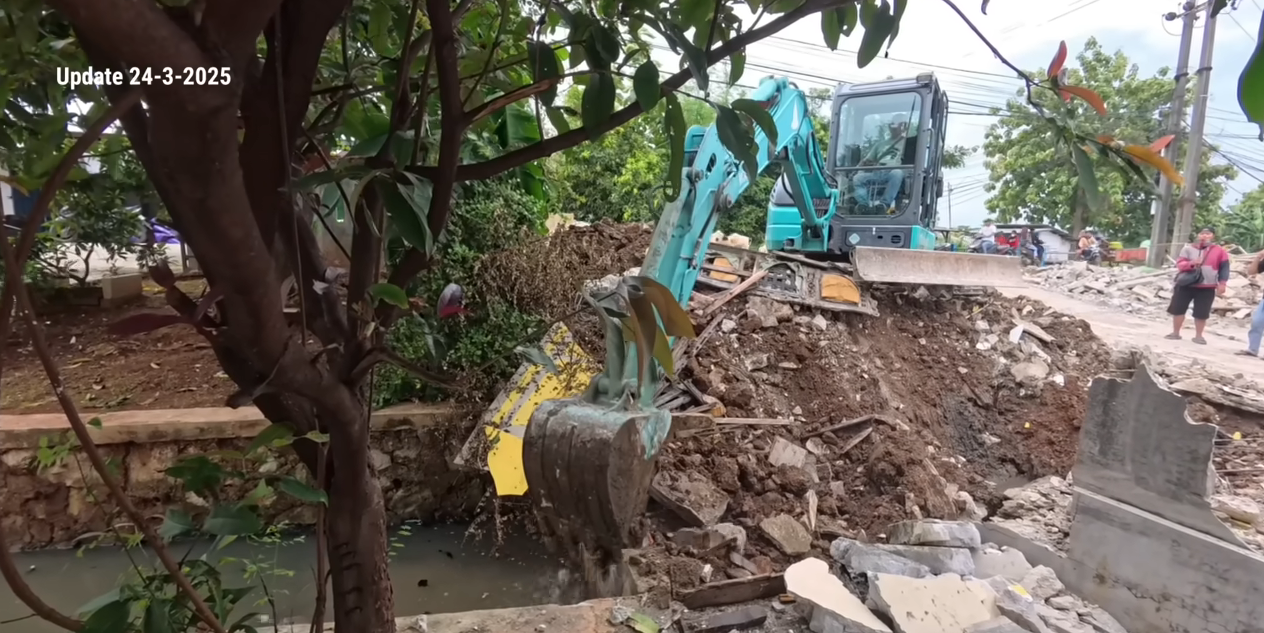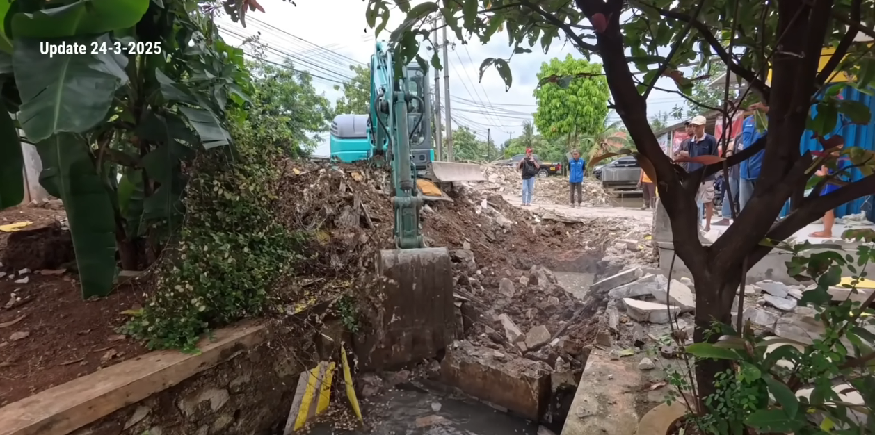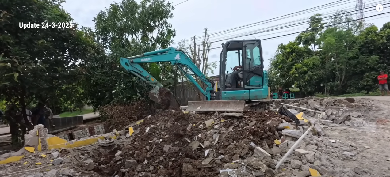 Kita bisa lihat dalam beberapa gambar di atas adanya air di bawah bangunan yang sudah di robohkan. Dan tepat di bawahnya tempat excavator mengurug tanah terdapat air yang mengalir.
