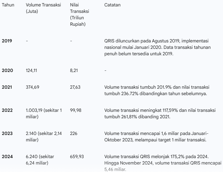 Tahun 2025 adalah tahun mayoritas pembayaran digital. Hal ini karena sejak pertama kali QRIS diluncurkan pada 17 Agustus 2019, volume transaksi tiap tahun bertambah sangat banyak. Berdasarkan data yang saya peroleh, rata-rata pertumbuhan pembayaran QRIS tiap tahun di atas 100% bro. Jadi benar-benar sangat banyak dan populer sekali. Bisa jadi QRIS adalah pembayaran masa depan masyarakat Indonesia.