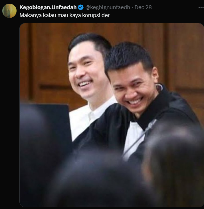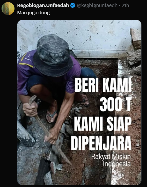 Beberapa netizen dan tokoh mulai menyuarakan satire terhadap kasus ini di platform X. Seperti contohnya akun Kegoblogan.Unfaedah. Berikut saya tampilkan berupa gambar agar tidak mudah hilang.